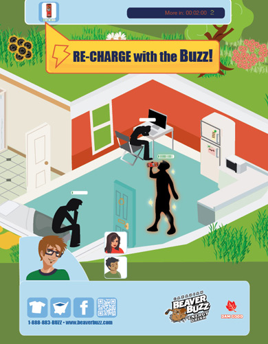 Conceptualized and illustrated an ad for Beaver Buzz. The Sims theme was used to target young demographic of college students who cram for their exams. The 'recharge with the buzz' slogan shows that they need to drink Beaver Buzz Energy beverage to get them wired to ace their exams. Analogous colour and witty silhouettes were used to denote fun and playfulness.